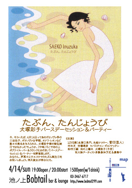 そ、そういえば、4月14日ってあのボサノヴァ界の 三田佳子、ボサノヴァ女学館、オナラ・レオンなど 数々の異名を与えられた、犬塚彩子様の御生誕 日ではなかったでしょうか。(中略)そこで池の上 ボブテイル・バー&ラウンジにおきましてバースデー・ セッション&パーティーを開催致します。 みなさん、声高々にサエコサマのたぶん誕生日を お祝いしましょう。例え彼女が来なくとも。